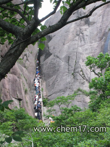 快到百步云梯時,突然發(fā)現(xiàn)前行的道路擁堵起來,這在六月的淡季可不多見。原來景區(qū)接待了一個大團,熙熙攘攘的人流全擠在一塊了,一路上變得躁動不安。百步云梯,順著上去就可以上蓮花峰,但是坡度極陡,有詩云:“云梯百步客心驚,曲折婉蜒接太清。莫說自然多險境,人生道路更艱辛。”雖然路程很短,爬上去卻已氣喘吁吁。