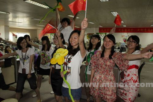 團隊組第三名,策劃部代表隊。專門定制的T恤,這個動作是“革命”。