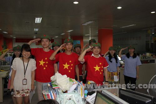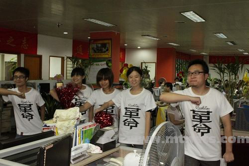 團隊組第三名,策劃部代表隊。專門定制的T恤,這個動作是“革命”。